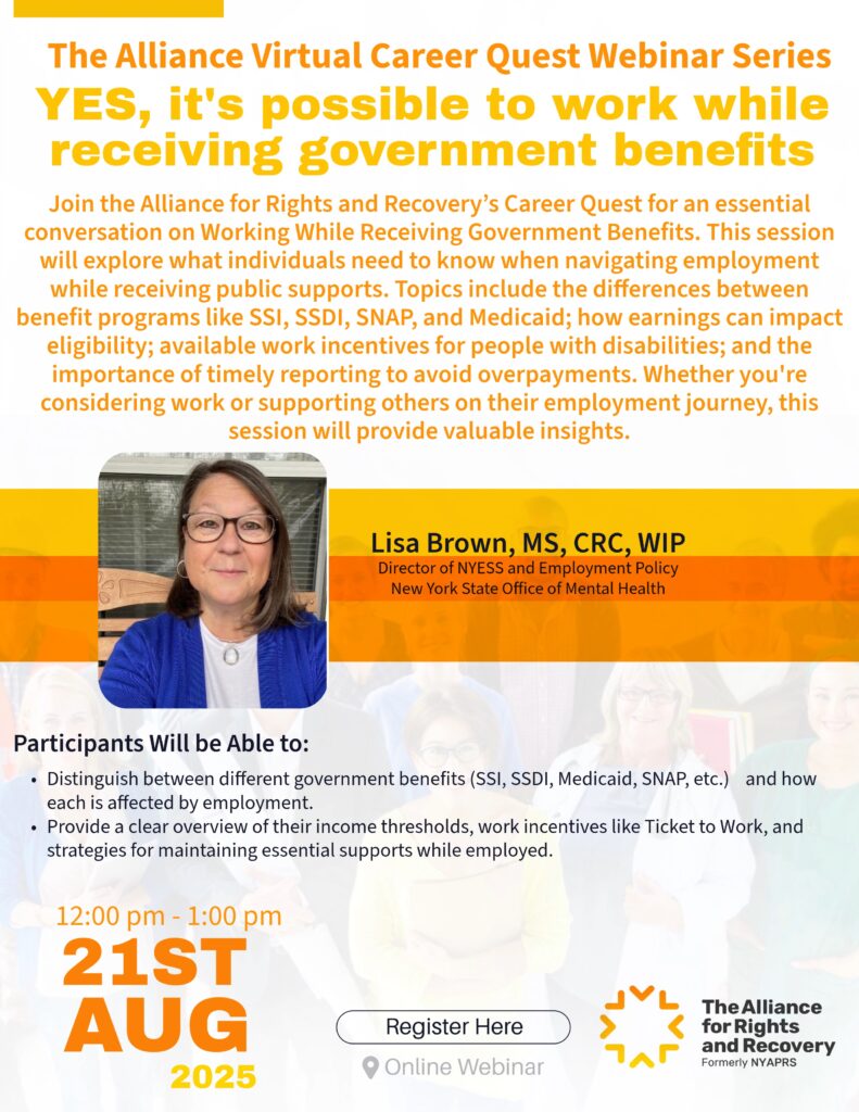 Our next installment of the Career Quest Series will be Thursday, August 21st, from 12:00pm-1:00pm. This session’s topic is Yes, it’s possible to work while receiving government benefits! It will feature Lisa Brown, Director of NYESS and Employment Policy at the New York State Office of Mental Health (OMH). See below for more information.