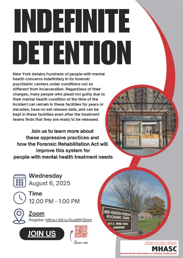 That’s why we urge you to attend today’s (Wednesday, August 6) 12pm webinar on the Forensic Rehabilitation Act (FRA)—a vital piece of legislation that aims to bring common-sense reforms to the state’s forensic mental health system- hosted by the Mental Health Alternatives to Solitary Confinement coalition.