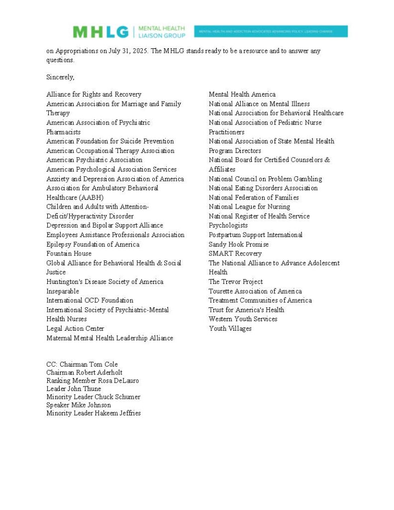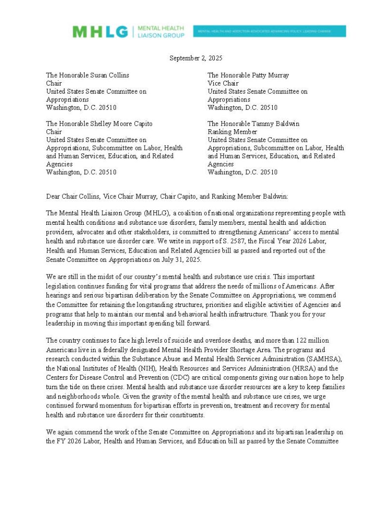 Alliance Alert: The Alliance for Rights and Recovery is proud to be a member of the Mental Health Liaison Group (MHLG) and to have signed on to their recent letter of support for the Senate Appropriations Committee’s passage of the FY 2026 Labor, Health and Human Services, Education, and Related Agencies bill.