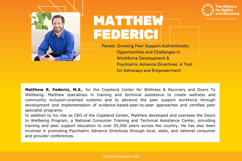 Kaely Whittington, CPRS Training Coordinator, On Our Own of Maryland; Ian Rodgers, Implementation Director for the Office of Advocacy and Peer Support Services, NYS Office of Mental Health, Matthew Federici, CEO and Ryan Tempesco, Program Manager, Doors to Wellbeing, Copeland Center for Wellness and Recovery; Moderator: Luke Sikinyi, Vice President for Public Policy, Alliance for Rights and Recovery