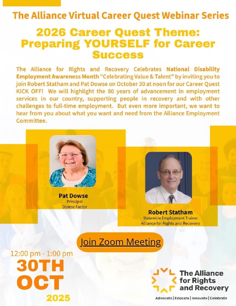 We are excited to kick off our Career Quest Series next Thursday, October 30th, from 12:00pm-1:00pm! This installment will be a unique opportunity to hear about the 80 years of advancement for employment services supporting people in recovery as well as a chance to share feedback with the Alliance Employment committee and help shape our future career quest webinar offerings. Join Pat Dowse and Robert Statham as we celebrate National Disability Employment Awareness Month and continue advancing and improving our employment services for people in recovery!