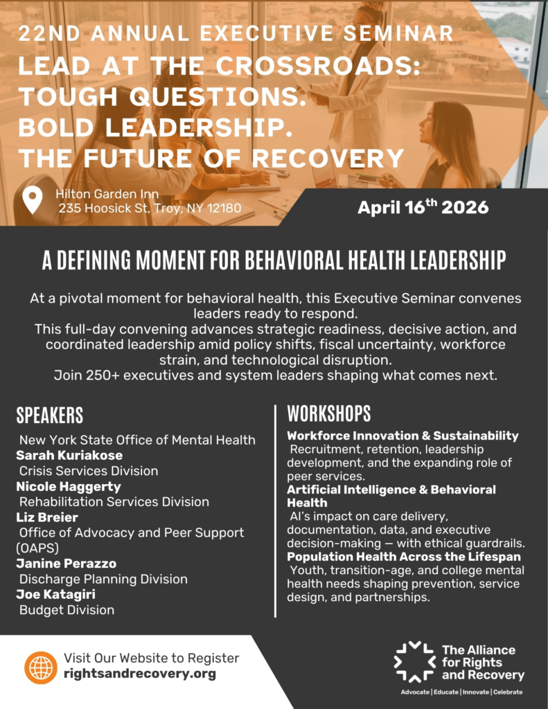 At a time of rapid change across behavioral health, the Alliance for Rights and Recovery’s 22nd Annual Executive Seminar brings together the leaders shaping what comes next. Lead at the Crossroads: Tough Questions. Bold Leadership. The Future of Recovery convenes executives, policymakers, providers, and innovators for a full day of strategic dialogue, practical solutions, and forward-thinking collaboration.